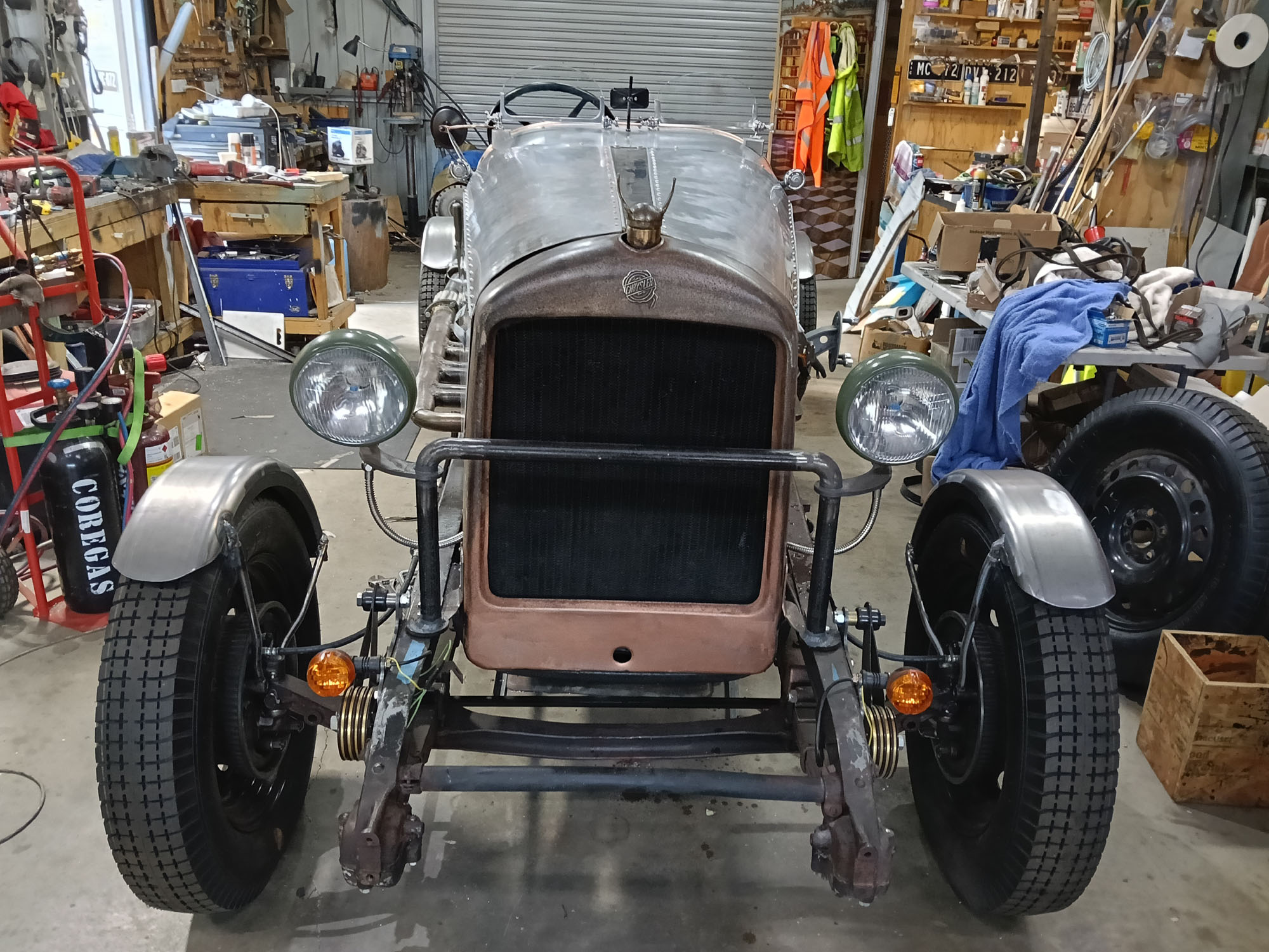 I made a light bar from 1" steam pipe with 8mm stanchions that curve around to mount the lights beside the radiator. That put the lights in about the right place to resemble a 29 Chrysler. - if you squint .