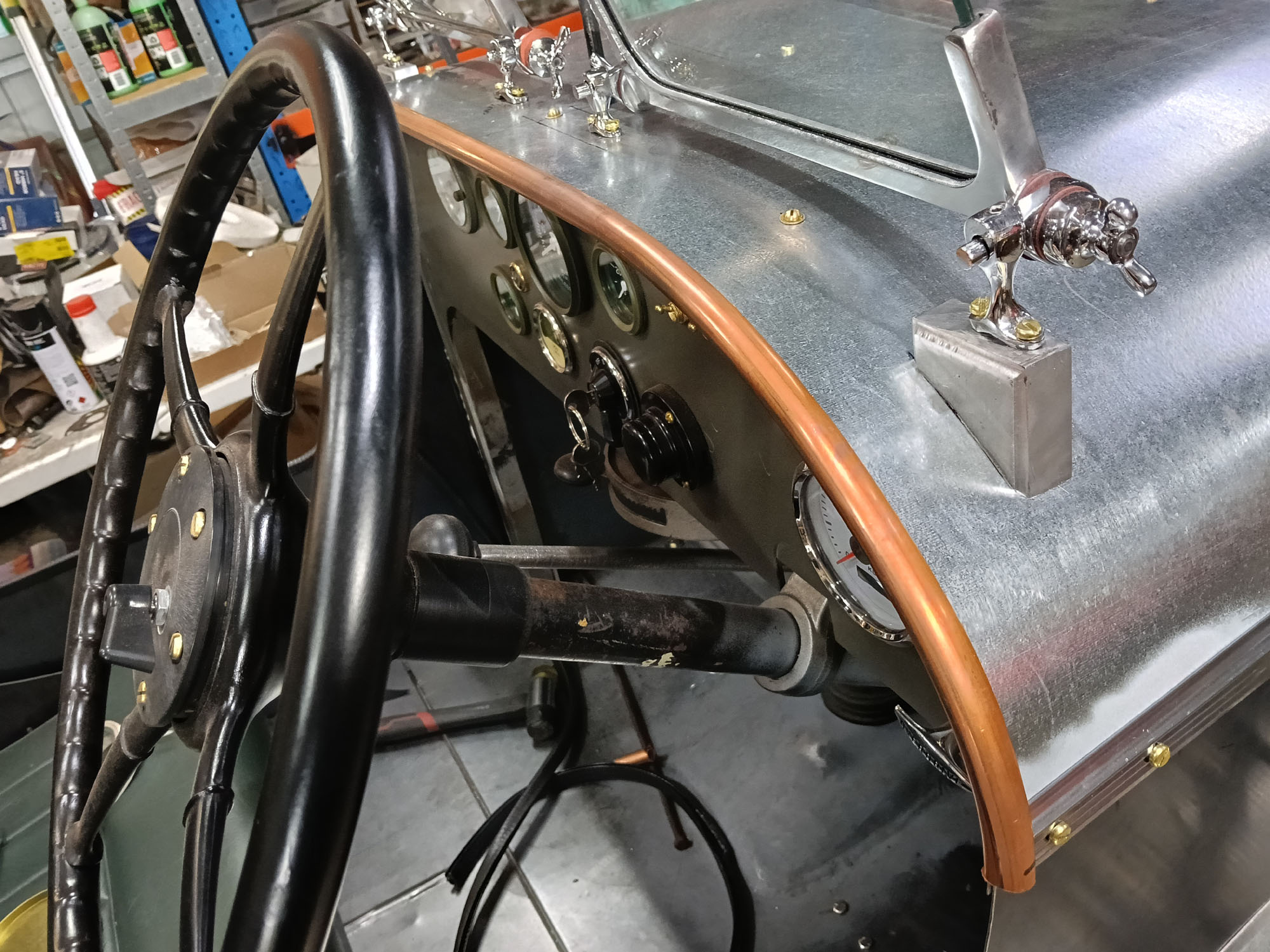 100 years ago the copper edging would have been soldered to the sheetmetal but I opted to fill the pipe with Automotive Sikaflex and push it into place. The result is better than I had hoped. I did the coaming in 3 sections with joiner pieces so that the Cowl lid could be more easily removed if ever necessary..