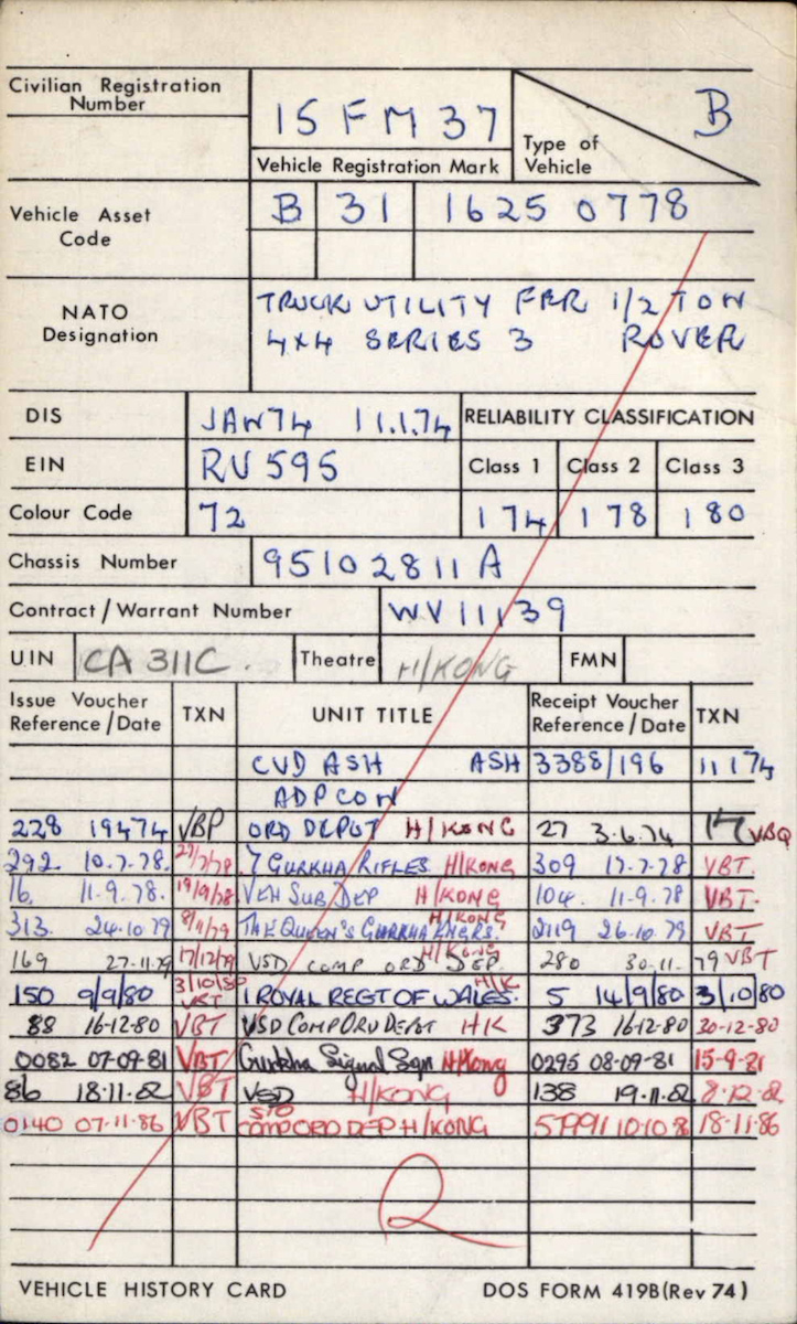 First job was to trace it's MOD history from Military Reg no 15FM37 . I acquired the "B-Card" (pictured at right) from MOD Archives and it shows my Lightweight spent its entire military career in HongKong and spent most of its time there with the Gurkhas.