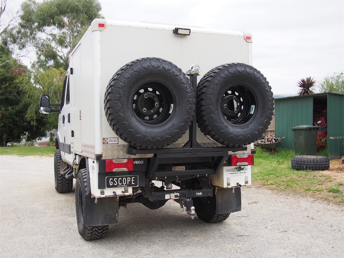 The Truck comes with 17.5x6" steel rims with 9.5R17.5 Michelin XZY road tyres, which are a great load carrying truck tyre but not good offroad, Iveco option is a 16x6 Split rim with Michelin 255/100R16 Michelin XZL Off Road tyres (with 100kmh speed limiter) . I have fitted Ridgeline 17x9 Rims with 35x12.5R17 125Q Mud Terrains.