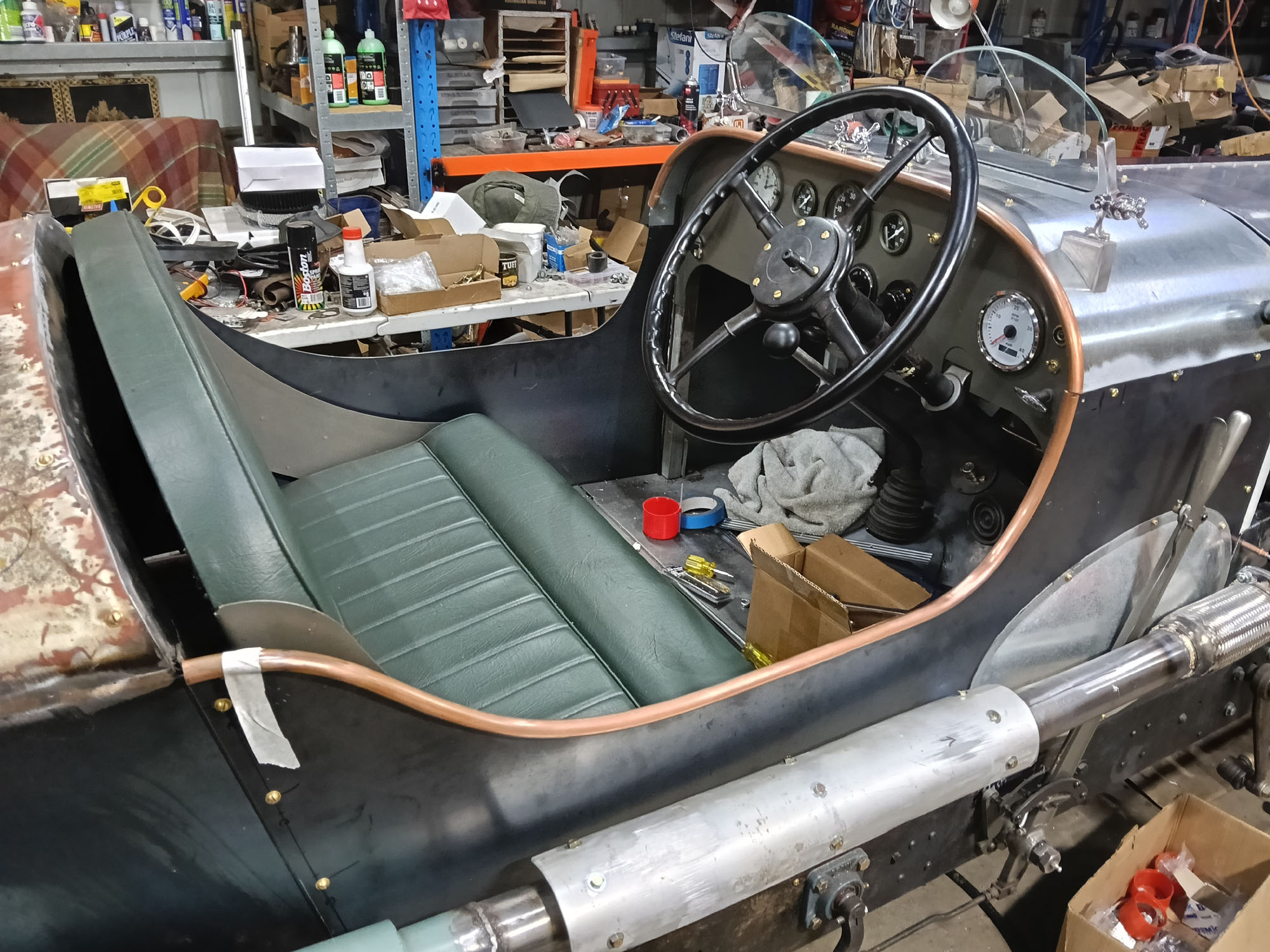 100 years ago the copper edging would have been soldered to the sheetmetal but I opted to fill the pipe with Automotive Sikaflex and push it into place. The result is better than I had hoped. I did the coaming in 3 sections with joiner pieces so that the Cowl lid could be more easily removed if ever necessary..